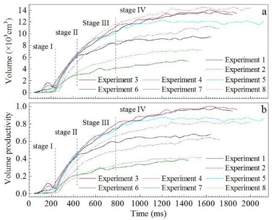 Temporal evolution. (a) Time-history curves of volume, (b) time-history curves of volume productivity (the ratio of the outlet gate volume to the initial volume).