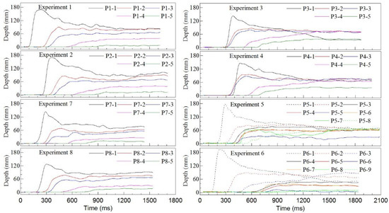 The time-course curves of the sampling probe are shown in Figure 13. The relatively large differences between these curves were discovered by analyzing data from all the experimental groups. For Experiments 3 and 6 (the volume productivity close to 1.0), the depth of the rear sampling probe (P3-1 and P6-1) was subjected to a rapid increase followed by a gradual decline; the binding point (P3-2 and P6-2) remained constant after reaching its maximum; the change of the middle sampling probe (P3-4 and P6-3) consisted of a fast increase followed by a slow increase; and the value of the front sampling probe (P3-5 and P6-4) was the same as the binding point growth rate. For the other experimental groups (volume productivity less than 1.0), the time-course curves of some sampling probe were quite different from Experiments 3 and 6. For example, in Experiment 1 (fine gravel), the depth of the rear sampling probe (P1-1) rapidly increased and appeared to show a gradual decline before decreasing to attain the equilibrium value. The depth of the anterior part (such as the binding point, middle sampling probe, and front sampling probe) remained constant after reaching its maximum. For Experiment 2 (quartz sand), the depth of the rear sampling probe (P1-1) first showed rapid growth and then displayed a slow increase after a gradual decline. For all the remaining experiments (Experiments 1, 4, 7, and 8), the change law of the depth was very similar to the situation of Experiment 1.