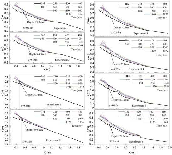 The time series of typical profiles are shown in Figure 15 from which the same conclusions can be drawn; i.e., the thickness of the intermediate and leading area increased gradually and the thickness of the trailing area first increased then decreased. Another observed phenomenon is that the travel distance of the debris increased rapidly in the early phase and gradually reached a steady state in the late phase. Another interesting finding is that there exists an intersection point for each profile lines in all the experimental groups. Once the maximum was achieved, the thickness remained constant. There were common intersection points for all the profile lines, where the first point to observe at which the thickness (or depth) of the debris remains constant after reaching its maximum was termed its “binding point”. Figure 15 shows the specific location for these points. The x-coordinate value of these points is dependent on the experimental conditions. For the slope shape, their sequence is slope B > slope A > slope C. The groups of quartz sand have a larger x-value than the control groups. Again, there is little adverse influence on the x-coordinate value in the experiment with the lower barrier. The ranking for the x-coordinate values is the same as those of the volume. That is, the larger volume, the larger the x-coordinate value of the binding point. To answer questions as to why and how this occurs, perhaps a more detailed analysis of energy conversion behavior, quantifying the collisions and interactions of the debris will be necessary. Due to space limitations, we will show these results in the follow-up work.