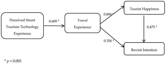 Table 4 and Figure 2 shows that each path coefficient is greater than 0.2, the T value is greater than 3.29, and the P value is less than 0.001, which means these paths are significant. The results indicate that perceived STTs are positively associated with tourists’ travel satisfaction, which supports H1. The study also found that tourists’ travel satisfaction was significantly associated with tourist happiness, supporting H2. Regarding the relationship with tourist revisit intention, there was a positive relationship between tourists’ travel satisfaction and happiness, which supports H3 and H4 (See Table 5 and Figure 3). Moreover, the total effect (0.737) of tourists’ travel satisfaction on revisit intention is greater than the value of path coefficient (0.356), indicating that as an intermediary variable, tourists’ happiness weakened the effect of revisit intention. In conclusion, all hypotheses were supported in this research model.