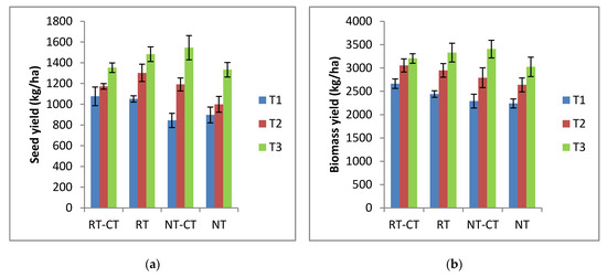 Effect of tillage, nutrient, and interaction of tillage and nutrient on the seed and biomass yield (kg/ha) at maturity in soybean in the year of 2017. LSD (p < 0.05) to compare the means of treatment for seed: T = ns; N = ns; TxN = 308; and straw: T = ns; N = ns; TxN = 586. RT: reduced tillage; NT: no-tillage; RT-CT: reduced tillage converted to conventional tillage; NT-CT: no-tillage converted to conventional tillage. (a) seed yield; (b) biomass yield.