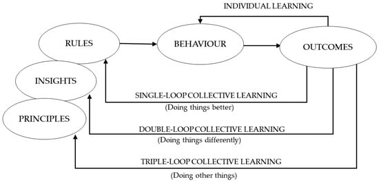 Swieringa and Wierdsma [24], following the work of Argyris and Schön [16], presented a model (Figure 2) of organizational learning that allows us to differentiate between individual and collective learning, distinguishing three loops: Single-loop learning, which affects organizational rules and norms (doing things better); double-loop learning, which refers to insights and vision (doing things differently); and triple-loop learning, which has to do with principles (doing other things) [25].