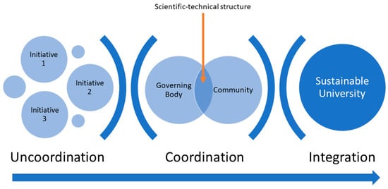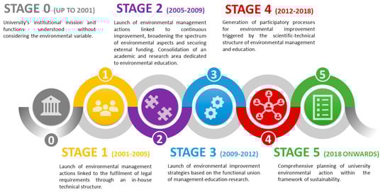 The final stage would be one of ‘integration’, in which a dynamic characterized by a robust environmental organizational culture would be achieved, as an unconscious competence [46], that structures all levels and areas of the university and establishes processes of continuous environmental improvement within the framework of sustainability, perceived as the norm and developed through integral planning.