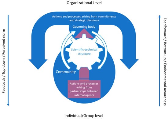 The model incorporates criteria used to characterize actions and processes within the framework of organizational learning, such as the direction and the level from which they are initiated. It also identifies the main actors: Governing body, scientific-technical structure, community, and internal partners (although external partners such as inter- or supra-organizational entities do not appear explicitly, they can also be considered at a higher level). Actions and processes flow in two directions that feed back into one another: On the one hand, within the university community, actions and processes emerge, arising mainly from partnerships between internal agents, with a bottom-up approach from the individual/group level to the organizational level. This feedforward direction makes it possible to strengthen environmental awareness at all scales. On the other hand, in a complementary and synergistic way, the governing body reacts by developing through feedback a series of actions and processes arising from strategic commitments and decisions, which permeate all structures and collectives in a top-down direction, acting on the perceived norm. This model highlights the role of a scientific-technical structure as a stabilizing force, a catalyst, facilitator, attractor, and to a large extent executor of transformative flows within the organization, which could be a key factor in its evolution towards sustainability. These flows, taking into account the context of complex organizations such as universities, could push the system towards higher maturity levels, thus generating a spiral of continuous improvement in the organization’s environmental performance, associated with progressive levels of environmental awareness and the perceived norm.