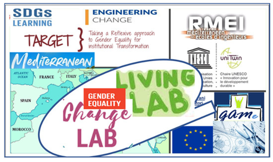 Finally, our methodology is grounded empirically in the tailored practices of the gender equality Change Lab, embedded in the network of Mediterranean engineering schools that is a collective organizational integrity, taking into consideration the interconnectedness of SDGs, SDG5 with engineering education and practice. The methodology of this Change Lab is only schematically depicted in Figure 1, in a picture consisting of a domain of interconnections among the network (RMEI), the Mediterranean engineering schools, the TARGET project, the GAMe sub-network of RMEI students (https://rmei.cc/0/index.php/fr/programme/michel-angelo/what-is-game) with SDGs learning in Mediterranean countries higher in engineering education.