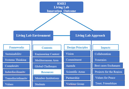 In Figure 2, the Living Lab’s environment integrates the frameworks of sustainability, systems-thinking, complexity transdisciplinarity, interdisciplinarity, and ethical values that are the cornerstones of engineering education of the 21st century. The RMEI’s Living Lab, as Figure 2 shows, is an engineering-context, Mediterranean-centered lab that uses human resources that the member-institutions provide, and the students of the member-engineering schools to advance the education on global challenges and prepare engineers to work on sustainable innovations.