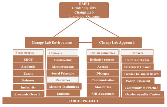 In Figure 3, the Social Lab’s environment integrates the frameworks of SDG5 on the empowerment of women in academia, fairness and inclusion in Mediterranean higher engineering education towards the economic growth of the Mediterranean region that faces many socio-economic and environmental challenges. The RMEI’s Change Lab, as Figure 3 shows, is an engineering-context, Mediterranean-centered lab that catalyzes the gender equality changes with the support of the