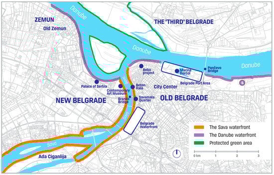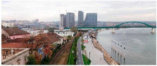 The present-day riverfront along the Danube and Sava (Figure 1) was shaped in the period after World War II, during socialist Yugoslavia (1945–1991). Most of the efforts were given to create New Belgrade (see: Figure 1), a new modernist core city within Belgrade, across the Sava River from Old Belgrade [34]. In line with the contemporary functionalist style, this part of the city was built in a super-blocks structure—open blocks with mass housing as a dominant urban function and a lot of greenery around it. Several blocks were dedicated to the most important institutions of socialist Yugoslavia, such as the Building of Federal Executive Council (today known as the Palace of Serbia) [35]. New Belgrade waterfronts on the Danube and Sava followed these modernist tenets; they were created as a pedestrian quay “inserted” between the river and green riverside belt.