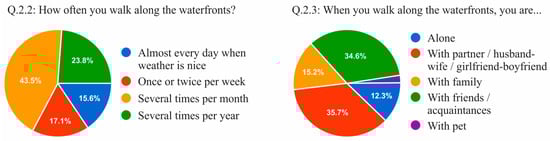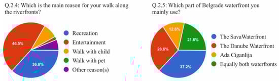 The first part of the questionnaire consisted of four thematic questions intended to clarify the general character of respondents’ use of the city riverfront. The first question was a key to continue to the survey, and 95% of respondents answered positively and thus continued to the next questions. Even those people who did not use the riverfronts presented at 5%. Their participation in this survey shows that a general interest in the city riverfront development is not limited to just those Belgradians who actively use the city waterfront; the other ones are also interested in waterfront development due to its significance for the entire city. The overall majority of respondents (>95%), however, actively used Belgrade waterfronts (Figure 3, left). Almost one-sixth of all of them used the riverfront daily, and the majority of them (44%) stated they walked along the rivers several times per month.