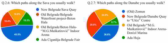 Both riverfronts are not “monoliths” by use patterns yet. Many parts of the riverfronts are specific by their development, and their influence on users differs greatly (Figure 5). In the case of the Sava (Figure 5, left), New Belgrade Quay (48%) is most used. For the Danube (Figure 5, right), it is Zemun (37%), although answers were more dispersed. However, responses to both questions clearly indicate that the parts of the waterfronts located in Old Belgrade are not the most used ones, despite their central position (Figure 5).