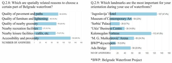 Response ratio in the previous question was more or less expected. Thus, the next question was related to the issue of urban landmarks in the Belgrade waterfront, which are also recognizable physical elements in the urban fabric but have a deeper, psychological meaning; they help in individual orientation in urban space and thereby define an environment as familiar or unfamiliar [45]. The analysis shows that the most important landmarks for respondents were the “Jugoslavija” Hotel (47%) in Zemun and Kalemegdan Fortress (41%) in central Belgrade (Figure 7). The first result generally concurs with the significance of the Danube riverfront in Zemun. In contrast, the surrounding riverfront parts around the Kalemegdan Fortress, which is a monument of extraordinary national importance, were not the first choices by respondents.