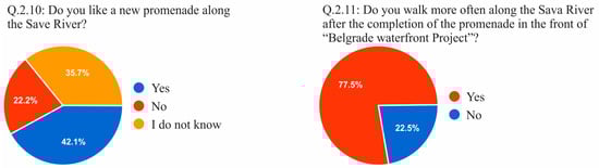 The option that got the minimal support by respondents in the previous question—new towers in the BW Project—was somehow an overture in the last block of two questions. It concerned this project in progress, which is certainly the largest one along the entire riverfront in Belgrade. The first question was more related to the new promenade along the Sava River, in front of the new towers (Figure 2). The answers about the general affinity toward the promenade were rather divided by respondents (Figure 8, left), but the relative majority of respondents (42%) appreciated the new development. In the last question of the survey, which closely connected the promenade with the BW Project, to a large extent the attitude of respondents was a bit different (Figure 8, right). While the majority of respondents did not walk more often along the Sava River after the completion of the promenade in the front of the project, a sizable minority did (23%).