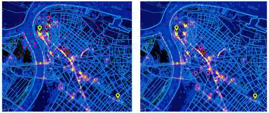 The spatial distribution of the photos taken by Twitter in Old Belgrade in the analyzed period (2015–2018) indirectly represents the increase of the importance of the Sava waterfront. In 2015, the only place on the riverfront that was a major Twitter spot by photos taken was the aforementioned Beton Hala as an already established place for socialization on the riverfront (Figure 9, left). Nevertheless, two new places appeared in 2018; the area south to Beton Hala (passenger pier) and the BW Project site (Figure 9, right).