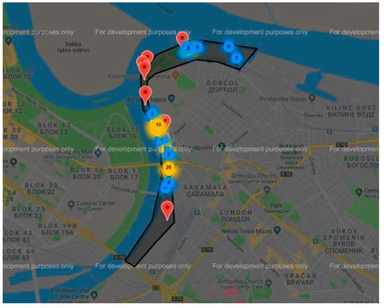 In order to properly illustrate the possibilities of the TSE, tweets that were collected for the Belgrade riverfront over a period of eight months (January–August 2018) were spatially analyzed and the results of this analysis are shown by the space defined by the corresponding polygon on the map, together with the spatial distribution of tweets (Figure 10).