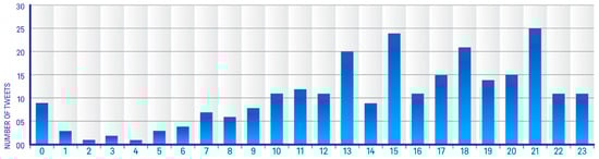 - Temporal frequency: This zone was vibrant during the weekend days—Saturday and (late) Friday (Figure 11), as well as in the evening time; tweets were the most frequent at 9 p.m. and generally above the average until midnight.