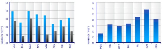 Temporal classifications of Tweets for the central part of Belgrade riverfront per month (left) and per weekday (right) for January–August 2017. Left image: Blue columns—tweets; Dark columns—images posted on Instagram via Twitter (authors: J. Joković and N. Dinkić 2018).