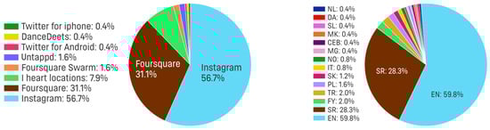 In addition to the spatial and temporal distribution of tweets, their content can be analyzed and classified by language using the TSE application. To repeat, Twitter has the possibility to share the data through different applications, such as Instagram or Foursquare. All used applications by Twitter are included in the language analysis (Figure 13, left). The share of used languages on tweets collected in the analyzed area was as shown in Figure 13, right.