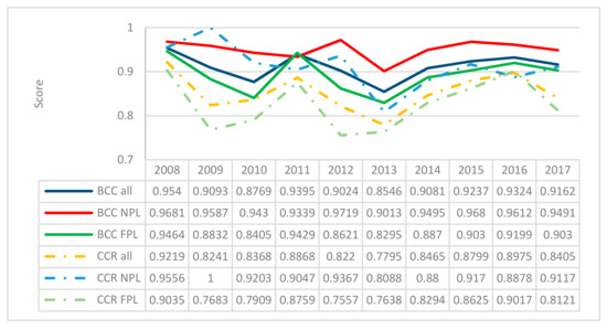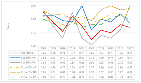 Social and economic mean efficiency scores, all entities, FPL and NPL, BCC model, by year 2008–2017. Source: own elaboration.