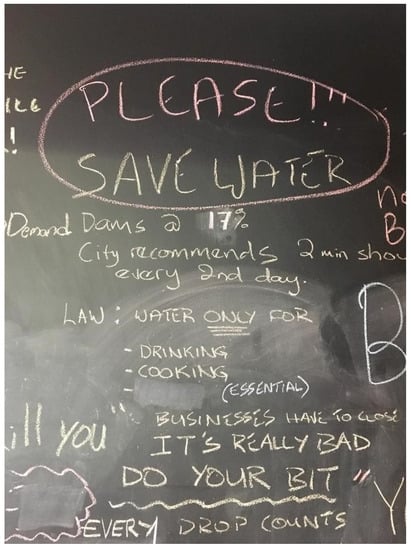 - York, G. Cape Town Residents become ‘Guinea Pigs for the World’ with Water-Conservation Campaign. The Globe and Mail. Available online: https://www.theglobeandmail.com/news/world/cape-town-residents-become-guinea-pigs-for-the-world-with-water-conservationcampaign/article38257004/ (accessed on 12 August 2020).