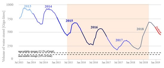 To delay or prevent “Day Zero”, personal use of water was limited to 50 L per person per day. The restrictions lead to a significant reduction in water usage [8,10]. After a period with strong rains in the winter of 2018, the reservoirs again reached 70 percent capacity and the water restrictions were eased. By changing the city’s habits, along with the welcome return of some rain, Cape Town managed to avert the worst of the water scarcity crisis in 2018 [8]. One year later, in March 2019, the dam levels had reached 80%, but the risk of future shortages still remains since the demand for water is increasing and South Africa is one of the world’s driest countries [10]. Figure 3 presents a graph of the total reservoir water available to the residents of Western Cape from 2013 to early 2019.