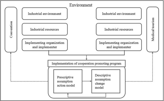 Since prescriptive assumptions are preconditions for implementing and reinforcing cooperation programs, the activation of ‘communication’ with each other, and the formation of trusting and depending attitudes are necessary. These affect the ‘perception’ of the necessity and effectiveness of cooperation among the convention industry and medical tourism stakeholders as a descriptive assumption and create the intended outcomes. From the viewpoint of the action model, communication, and the formation of attitudes toward each other are implementing. From the viewpoint of the change model, the construction of cooperation systems under goal setting, and the creation of outcomes have causal relationships with each other as a virtuous cycle (Figure 2).