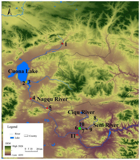The study was conducted in the Nujiang headwaters of the Qinghai–Tibetan Plateau (Figure 1), which is one of the largest rivers (1.65 × 103 km) on the plateau, with an average runoff of 4.96 × 1010 m3, a drainage area of 1.36 × 105 km2 and an average elevation of more than 4000 m [30]. Upstream, the Nujiang River originates from the Tanggula Mountain Glacier (6000 m) and flows through the alpine meadows of the central plateau. Further downstream, the river passes through major cities such as Nagqu, Baoshan and Tengchong and finally flows into South Asia. The Ciqu and Seni Rivers comprise the primary and secondary tributaries of the main flow (Nagqu River) of the Nujiang, with lengths of 104 and 30 km, respectively. These two rivers run through Nagqu city, and water quality is strongly affected by anthropogenic activities. Cuona Lake absorbs the main river flows and is the highest (4650 m) freshwater lake in the world, covering an area of 300 km2.