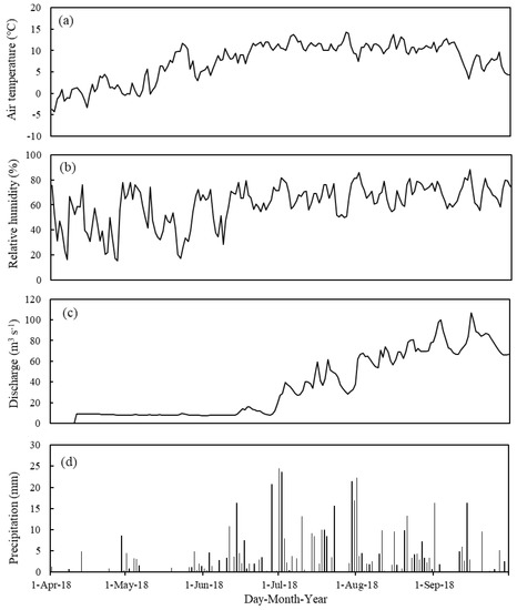 Figure 2 illustrates the daily variations in air temperature, relative humidity, discharge and precipitation in the Nujiang headwaters from April to September 2018. The average air temperature was the highest in July (11.3 °C) and the lowest in April (0.4 °C) (Figure 2a). The relative humidity ranged from 44.69% to 69.80%, with the highest occurring in September and lowest occurring in April (Figure 2b). The discharge of the Nagqu River from July to September (average 61.94 m3 s−1) was significantly greater than that from April to June (average 8.11 m3 s−1) (Figure 2c). During the six-month study period, July (187.2 mm) and August (120.0 mm) had the most monthly precipitation, accounting for 36.7% and 23.5% of the total, respectively (Figure 2d).