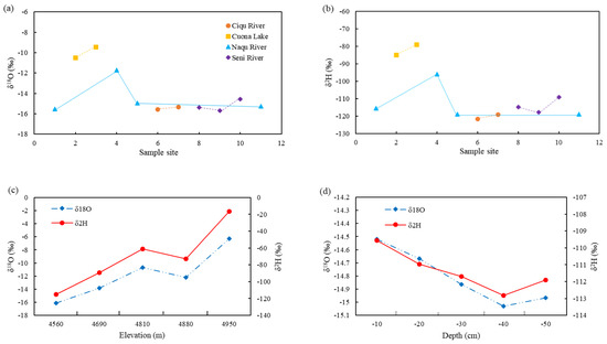 The isotopic values from upstream to downstream ending at Cuona Lake in the Nujiang headwaters could be clearly distinguished. The δ18O and δ2H values of Cuona Lake were significantly higher than those of the Nagqu and Ciqu Rivers. The relative values of δ18O (−11.7‰) and δ2H (−95.9‰) at Nagqu River sampling site 4 were also higher than those of all other sites. For comparison, sampling sites downstream of monitoring site 4 displayed no significant variations in isotopic values of the Nagqu and Ciqu Rivers (Figure 4a,b).