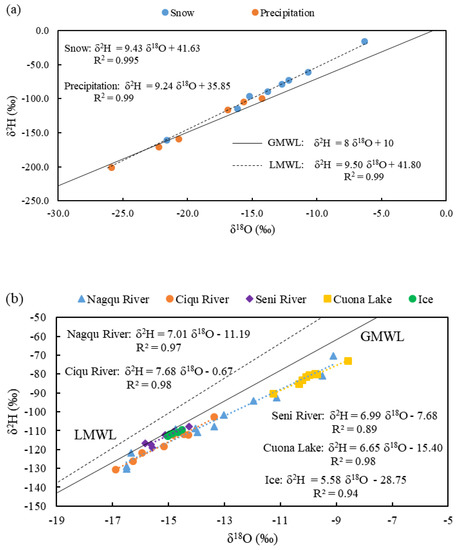 Based on the stable isotope composition of precipitation, snow and surface water (ice, the lake and the rivers) in the Nujiang headwaters, we established the local meteoric water line (LMWL) and the surface water line (SWL) as δ2H = 9.50 δ18O + 41.80 (R2 = 0.99; Figure 5a) and δ2H = 6.66 δ18O−14.90 (R2 = 0.98; Figure 5b), respectively. The slope and intercept of the LMWL were higher than those of the global meteoric water line (GMWL, δ2H = 8 δ18O + 10) [32], while those of the SWLs were lower than those of the GMWL, particularly in ice.