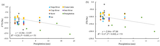 Previous studies have demonstrated that δ18O and δ2H values in water were linked to air temperature, relative humidity, precipitation and river discharge, which represented the “temperature effect”, “amount effect” and “altitude effect” [8,33,34]. In general, we found that δ18O and δ2H in all waters were negatively correlated with precipitation and air temperature (Figure 6a,b,d). Meanwhile, we also found δ18O and δ2H values in the Nagqu River were inversely proportional to the intensity of discharge (Figure 6e,f).