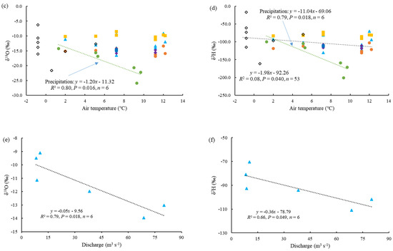 Correlation between δ18O and δ2H values and corresponding values of (a,b) precipitation, (c,d) air temperature and (e,f) discharge.