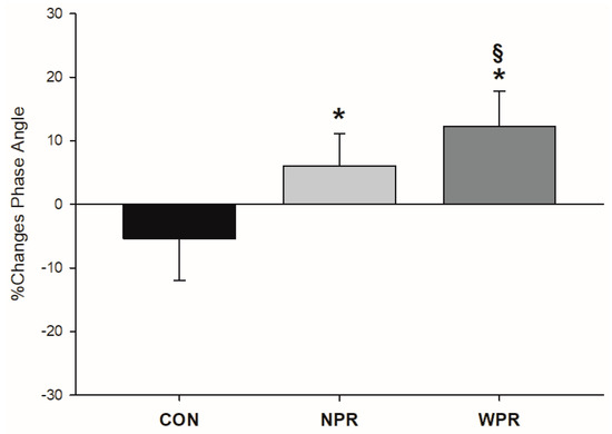Percentage changes on phase angle after intervention for control (CON, n = 18), narrow pyramid (NPR, n = 19), and wide pyramid (WPR, n = 18) groups. * p < 0.05 versus CON. § p < 0.05 versus NPR.