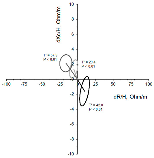 Fukuda et al. [8] reported that RT improved BIVA parameters in older women. Our findings revealed a similar change in the BIVA vectors in both training groups, indicating that increases were not influenced by different schemes of the pyramid RT system. However, for both CON and NPR groups, the R/H and Xc/H components contributed equally to the BIVA vector displacement. In contrast, for the WPR group, the change occurred due to the more significant reduction of the R/H component. Also, RT performed in the WPR system resulted in superior effect-sizes in Xc/H and ICW (ES = 0.71 and 0.52, respectively) compared to NPR (ES = 0.42 and 0.28, respectively) and Z/H (ES = 2.19 versus 1.03, respectively). These changes indicate a possible improvement in the integrity of the cell membrane, increasing the capacitance of the cells [7,12]. It has been postulated that cellular swelling in response to RT may induce an increased pressure on the cell membrane, which, in turn, threatens the cell’s integrity and thus leads to increased anabolic signaling and processes to enhance the cell’s ultrastructure [31].