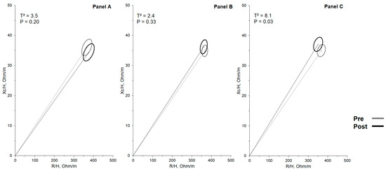 Mean impedance vectors with 95% confidence ellipses for control (Panel A), narrow pyramid (Panel B), and wide pyramid (Panel C) groups at pre- and post-intervention.