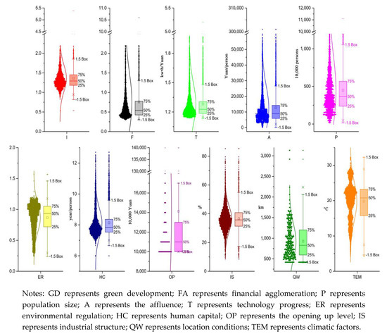 Descriptive statistics of the model variables are shown in Figure 1. According to the boxplots of variables, the original data of GD, P, HC, and IS are basically normal distributed without serious outliers. The mean values of the original data of FA, T, A, OP, and QW are larger than their median, which is in line with the characteristics of positive skewness distribution. The mean value of the original data of ER and TEM is less than the median, satisfying the characteristics of negative skewness distribution. Therefore, all variables in the model are logarithmically processed to make them closer to normal distribution, thus reducing model bias.