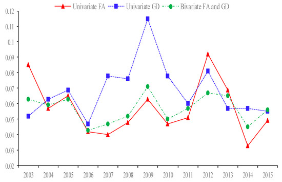 Other observations include: (1) From 2003 to 2015, the number of H-H clusters are mostly around 20 cities, accounting for about 20% of the examined regions. These areas are mainly concentrated in the Beijing-Tianjin-Hebei city cluster, the Yangtze River Delta and the Pearl River Delta, where the centers of China’s financial agglomeration are located. They have rich financial resources to significantly impacts that green development have on neighboring areas. (2) L-L clusters are the main pattern during the study period at the proportion of about 38% of all examined cities. (3) L-H cluster areas account for more than 30% of the cities with statistical significance. They are mainly located in the peripheral areas of the Beijing-Tianjin-Hebei city cluster, the Yangtze River Delta and the Pearl River Delta regions. That also includes most areas in Hebei, the border areas of Jiangsu, Zhejiang, and Anhui, and the two sides of Guangdong. Among them, the most significant change is that the peripheral areas of the Beijing-Tianjin-Hebei city cluster jumped from insignificant areas to be L-H cluster areas in 2009. (4) The average number of H-L clusters from 2003 to 2015 is about 8 cities. They are mainly situated in and around large industrial cities like Changchun, Wuhan, Chongqing, Panzhihua, Chengdu, and Xi’an. The above analyses demonstrate that the influence of financial agglomeration on green development has spatio-temporal non-stationarity.