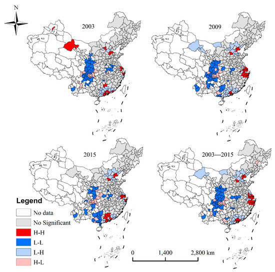The bivariate global spatial autocorrelation test can measure the level of spatial dependence and temporal non-stationarity on the whole but cannot describe the spatial non-stationarity. To this end, by using bivariate local Moran’s I as implemented in Geoda1.12, we adopt the bivariate local Moran test and BLISA to explore the local spatial correlation patterns of financial agglomeration and green development. To observe the trend over time, BLISA results from 2003, 2009, 2015 and the mean values from 2003 to 2015 are selected for visualization, as shown in Figure 3. ArcGIS10.2 is used to draw the local spatial autocorrelation BLISA graph at the level of significance p < 0.1(Figure 3). To observe the features of the four types of BLISA clustering patterns, the number of cities in different types is further counted (Table 2).