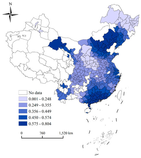 According to Table 3, the upper quartile and the lower quartile of the regression coefficients of financial agglomeration have the same direction as those in the results of the global regression model. This suggests that the model results are robust. The results also show that financial agglomeration has a significant positive spillover effect on green development, which supports the conclusion derived from the SPDM model. The differences in the effect of three models are probably related to the different aspects of non-stationarity considered by each model. In order to clearly identify the spatial heterogeneity of the impact of financial agglomeration on green development, we visualize the average annual regression coefficients of financial agglomeration in the GTWR model by using ArcGIS10.2 (Figure 4).