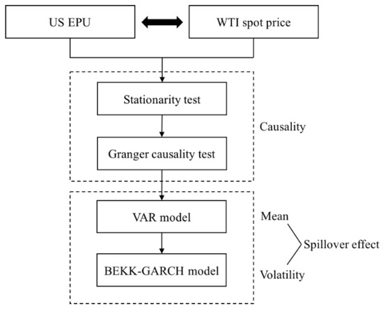 It is possible to use “multi-criteria decision-making” [43] and “time series analysis” [23] to measure the correlations between different indicators. To identify the mean and volatility spillover effect between US EPU and the WTI crude oil price, we used the VAR-BEKK-GARCH model. The research framework is displayed in Figure 1. First, we verified the causal relationship between EPU and the WTI oil price through the ADF stationarity test and the Granger causality test. Then, on this basis, we combined the VAR model and the BEKK-GARCH model to assess whether the transmission of information causes the price fluctuations to pass to the crude oil market when EPU fluctuates, as well as whether the shock to crude oil price will cause a fluctuation of the EPU. By integrating the results of the two models, the dynamic correlation between US EPU and the WTI oil price can be comprehensively understood, which can assist the stakeholders’ decisions in regard to risk management.