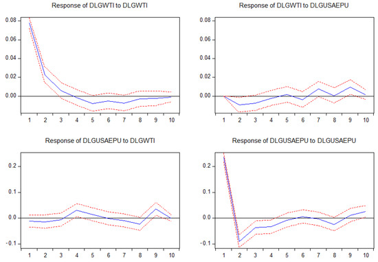 Furthermore, based on the off-diagonal elements of matrices A and B, we found that there was bidirectional volatility spillover between the WTI oil price and US EPU. Specifically, A (2,1) is significant at the 1% level, showing that the lag period of the US EPU can significantly affect the fluctuation of the WTI crude oil price. B (1,2) and B (2,1) were both found to be significant at the 1% level. The former proves that the WTI crude oil price has a substantial spillover effect on the change of the US EPU, and the latter indicates that the US EPU has a significant volatility spillover impact on the WTI oil price, which suggests that a bidirectional volatility spillover effect is present. The study [49] proposed that, in the United States, resource-based government revenues, such as crude oil revenue, are closely linked and interact with fiscal policies. In addition, Sturm et al. [50] also believe that in resource-rich countries, the source of domestic uncertainty is that public finances are vulnerable to fluctuations in oil prices and demand.