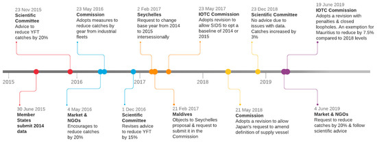 The issues arising from this “time-gap” were evident in the yellowfin tuna reduction measures adopted by the commission to mitigate the overfishing of the stock. In 2016, the IOTC members decided to take measures to reduce yellowfin tuna catches based on the scientific committee’s advice (based on 2014 data, as shown in Figure 1). One of the measures under Resolution 16/01 adopted in 2016 was for the purse seine flag states, with an over 5000 MT catch of yellowfin tuna to reduce their catches by 15% compared to the 2014 levels (IOTC, 2015). However, almost a year later in 2017, Seychelles submitted a letter stating that its fishing industry would collapse if the measure was to be implemented and requested to change their base year from 2014 to 2015 [39]. This was due to the fact that in 2014 the Seychelles purse seine fleet had fished 25,065 MT of yellowfin tuna, and in 2015 without a measure in place it had already fished 40,907 MT of yellowfin tuna. If Seychelles were to reduce its yellowfin tuna catch according to the measure, they would have to reduce it to 21,387 MT (15% reduction in the of 25,065 MT of yellowfin tuna caught in 2014), which is around 47% compared to the 2015 levels. The commission in 2017 agreed to take onboard Seychelles’ concerns and revised the measure (IOTC Resolution 17/01). A similar trend was observed in the 2019 commission meeting. Additionally, Mauritius had developed its purse seine fishery beyond the allowable threshold as per the measure (increased its catches to 7,681 MT in 2017); the commission allowed Mauritius to reduce their purse seine catches from the 2018 levels, even though they did not submit their data for the 2018 levels at that time [23].