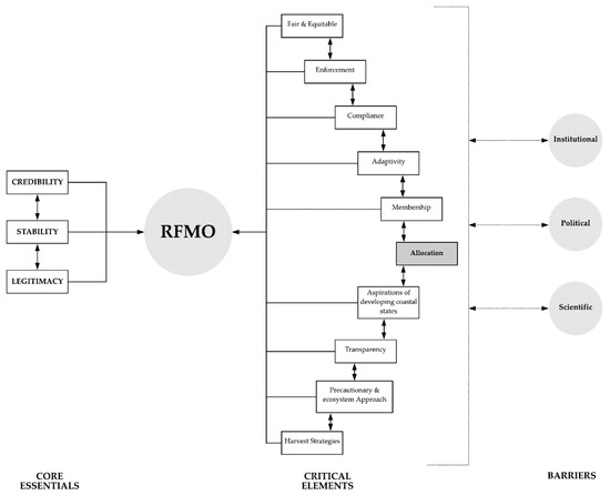 For a multilateral organization such as the IOTC to govern effectively, the organization needs to be legitimate, credible, and stable. To succeed, the organization need not only fulfill its mandate under the convention or the agreement or other international laws, but must also fulfill the expectations and perceptions of the players involved in the decision-making processes of RFMOs. As shown in Figure 2, critical elements for the performance of an RFMO are a fair and equitable decision-making process, compliance, monitoring, control and surveillance, capacity to adapt (for example, to climate change, among other dynamic processes), memberships, the ability to include the aspirations of developing coastal states, transparency, allocation, and harvest strategies for species under the mandate of the commission [5,60,61,62,63]. However, in the case of IOTC, we have identified institutional, political, and scientific barriers that have impeded allocation negotiations (Figure 2). The issues identified in the paper raise questions about the future of the organization, including its credibility, stability, and legitimacy.