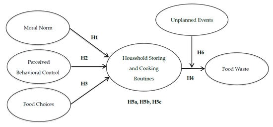 This study had three objectives: (1) to investigate the relationships among household moral norm, perceived behavioral control, food choices, household storing and cooking routines, and food waste; (2) to examine the mediating effect of household storing and cooking routines on the relationships among moral norm, perceived behavioral control, food choices, and food waste; and (3) to examine how unplanned events moderates the relationship of household storing and cooking routines to food waste.
