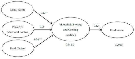Relationships between variables were tested by SEM. Based on Hu and Bentler [], the maximum likelihood estimation results indicated an adequate data fit (Comparative Fit Index, CFI = 0.952, Root Mean Square Error of Approximation, RMSEA = 0.056). Figure 2 also shows that hypothesis testing results demonstrated that moral norm was positively related to household storing and cooking routines, with a standardized coefficient of 0.22 *** (p < 0.001), which supported H1. Perceived behavioral control was not positively related to household storing and cooking routines, with a standardized coefficient of 0.05 (p = 0.097), which rejected H2. Food choices was also positively related to household storing and cooking routines, with a standardized coefficient of 0.54 *** (p < 0.001), which supported H3. The hypothesis testing results further demonstrated that household storing and cooking routines has a negative effect on food waste, with a standardized coefficient of −0.12 * (p < 0.05), supporting H4. In summary, H1, H3, and H4 were supported.