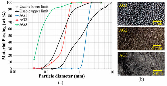 The results of sieving the shot and the wastes are shown in Figure 4, where the granulometric distribution curve of the AG1, AG2, and AG3 aggregates and photographs of them can be seen.