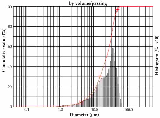 Due to the large percentage of material retained in the 0.075 mm, 0.044 mm, and bottom sieves, it was decided to analyze the AG3 by LASER granulometry. In Figure 5, the granulometric curve for AG3 can be seen, which presented an average particle diameter of 22.40 µm.