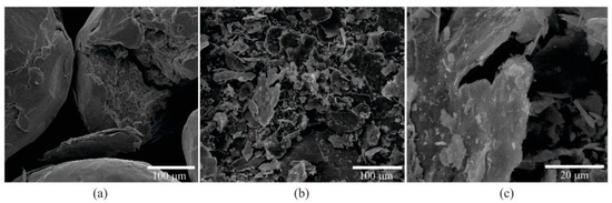 Morphology of the materials used as a heavy aggregate. (a) AG2, (b) AG3, and (c) AG3 with greater magnification.