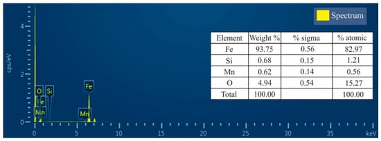 Associated with scanning electron microscopy analysis, the energy dispersive spectrometer (EDS) allowed the chemical elements of the region indicated in Figure 6c for AG3, thus obtaining the results shown in Figure 8.