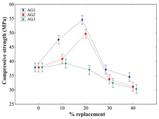 Figure 9 shows the behavior of the compressive strength of the materials produced according to the type of aggregate used and their replacement percentages. AG1 and AG2 aggregates showed increasing compressive strength values up to 20% replacement. For higher percentages, there was a decrease in the compressive strength, which fell below the compressive strength values of the reference mortar. AG3 showed decreasing results for compressive strength. Despite the lower results for the 40% replacement, the values obtained were above the minimum compressive strength (20 MPa) requirement of a structural concrete [42].