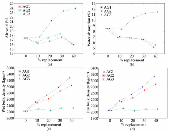 Graphs of (a) air void, (b) water absorption, and (c) saturated and (d) dry bulk densities in relation to the percentage of substitution for the different types of aggregates.